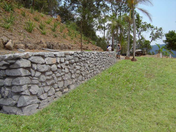 O muro de gravidade funciona através do seu peso próprio, que gera uma força de atrito com o terreno, resistindo aos esforços horizontais do solo. A espessura do muro e a profundidade da fundação são dimensionadas para garantir a estabilidade da estrutura.