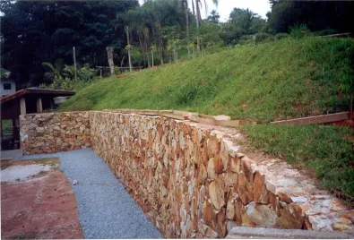O muro de gravidade é uma estrutura de contenção vertical que resiste aos esforços do solo através do seu próprio peso. É uma solução simples e eficaz para contenções de baixa e média altura, sendo amplamente utilizada em obras de engenharia civil.